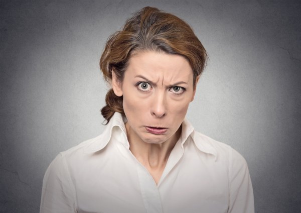 To wrinkle the brows, as in frowning or displeasure, in an angry manner