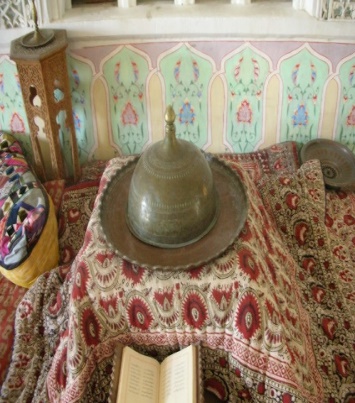 Smiling, Hasan Ali took out from under his arm a gilded robe, placing it on the sandal. Manba: Abdulla Qadiriy, Bygone days |