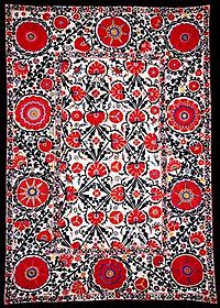 A type of embroidered and decorative tribal textile made in Uzbekistan, Tajikistan, Kazakhstan and other Central Asian countries. Suzanis usually have a cotton (sometimes silk) fabric base, which is embroidered in silk or cotton thread.